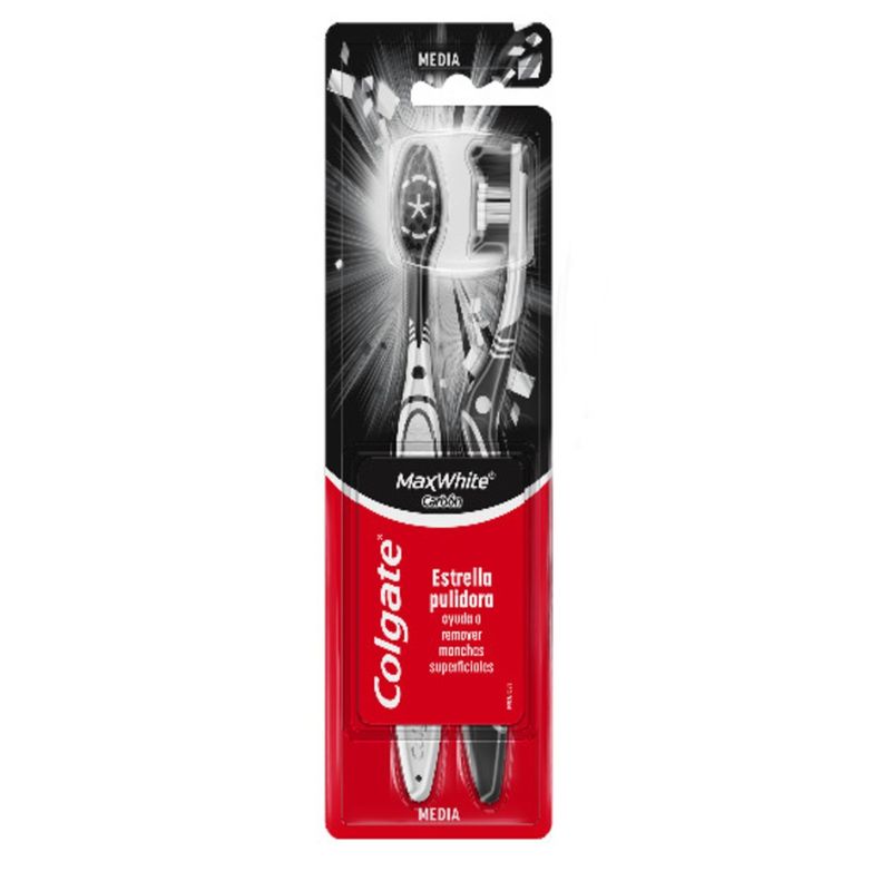 El cepillo de dientes Colgate Max White con cerdas infusionadas en carbón, con cerdas medias y estrellas pulidoras ayudan a remover manchas superficiales.