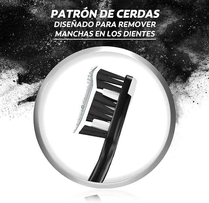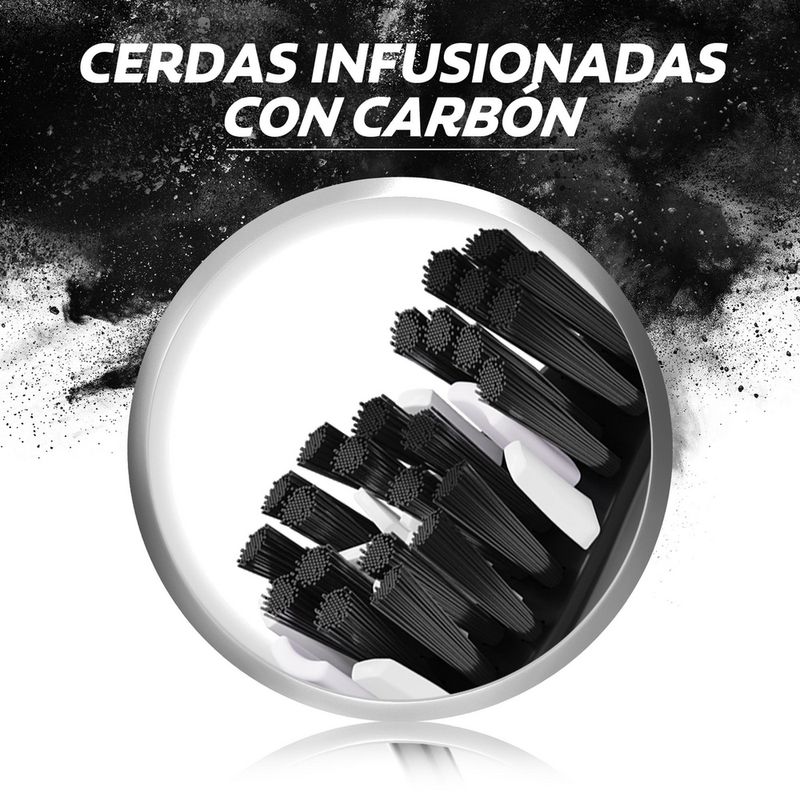 CARBÓN ACTIVADO: las cerdas negras están infusionadas en carbón, que ayudan a remover eficazmente la placa bacteriana y así evitar la formación de caries