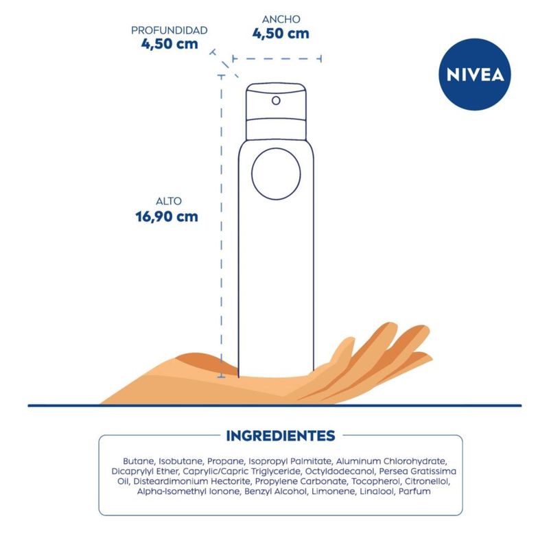 El Desodorante antitranspirante femenino NIVEA Fresh Coconut en aerosol, brinda 72 horas de confiable protección que cuida tu piel. Su innovadora fórmula de NIVEA INFINI FRESH, un ingrediente que otorga una frescura duradera en la piel. Está dermatológicamente probado y no contiene alcohol etílico. Es adecuado para todo tipo de pieles. NIVEA es la marca Nº 1 en el cuidado de la piel en el Mundo y en Argentina, con más de 100 años de trayectoria. Desde que inventamos la primera crema, NIVEA Creme, desarrollamos investigación constante para producir innovaciones que atiendan a cada necesidad de la piel de toda la familia. Nuestros investigadores se centran especialmente en la individualidad de la piel humana y en las diferentes necesidades de cuidado. Lo que ha dado como resultado que en las últimas décadas hayamos creado numerosos productos innovadores para el cuidado de la piel, desde desodorantes hasta productos de protección solar. BENEFICIOS -72 horas de protección antitranspirante -Frescura duradera -Dermatológicamente probado -Sin alcohol etílico -Apto para todo tipo de piel MODO DE USO 1) Agitar bien el envase antes de usar 2) Aplicar NIVEA Fresh Coconut Desodorante femenino a 15 cm de distancia de las axilas de manera uniforme y pareja 3) Dejar de secar antes de colocar la prenda de vestir 4) En caso de oclusión de la válvula agite bien el envase, ya que su presión interna libera la oclusión.
