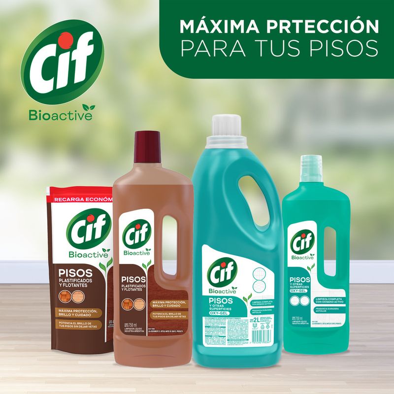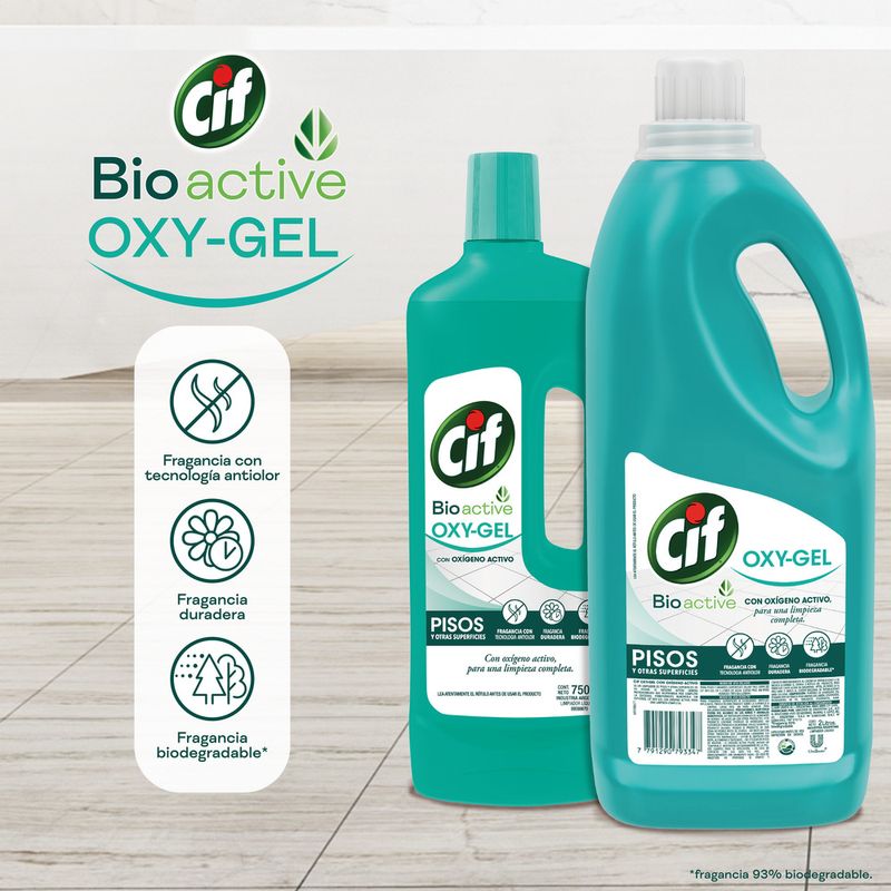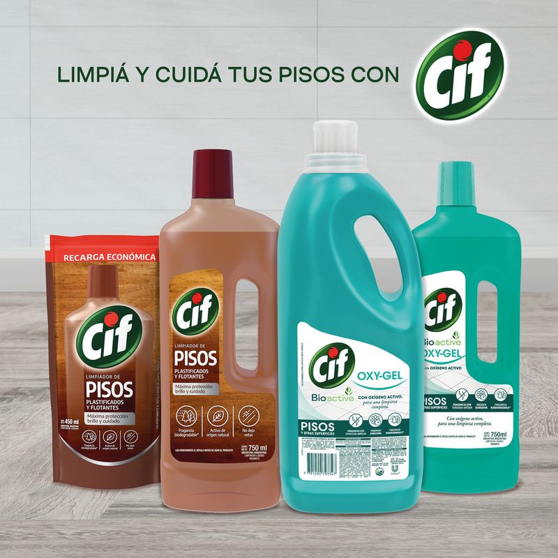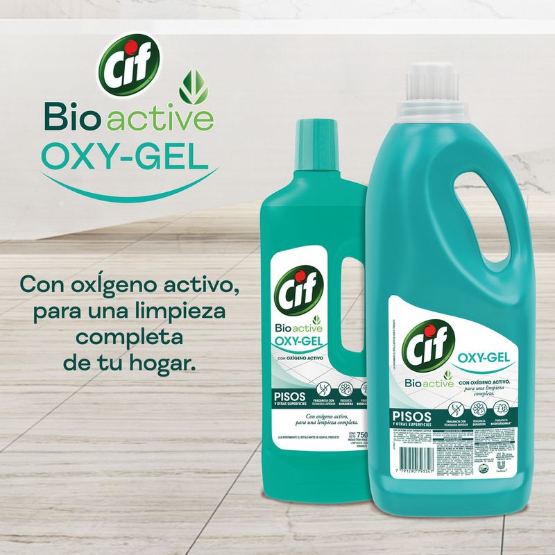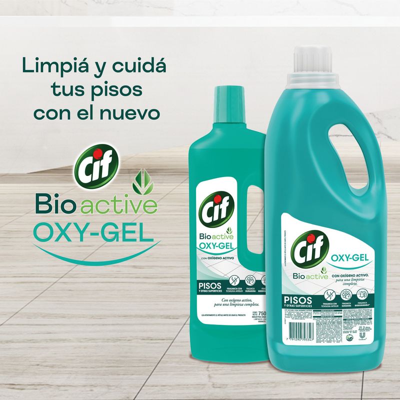 Nuevo Limpiador de Pisos CIF Bioactive Oxygel formulado con oxígeno activo que garantiza una limpieza completa de los pisos de tu hogar. Este limpiador de pisos contiene una fragancia duradera y con tecnología antiolor. Al limpiar el piso, se eliminan los malos olores, y la casa recupera su aspecto fresco y limpio. CIF Pisos Oxygel, limpia, desinfecta y perfuma los pisos de todo tu hogar. Este limpiador desinfectante contiene una fragancia con agentes biodegradables. Modo de uso directo: Antes de limpiar cualquier superficie, barrer para quitar el polvo primero. A cada uno de los tipos de pisos, entre tantos, le corresponde su propio producto de limpieza. Para pisos y grandes superficies, diluir tres tapas del limpiador líquido Cif Oxygel en 5 litros de agua. Y para superficies pequeñas o suciedades difíciles, aplicar el producto directamente sobre la superficie a limpiar. Luego pase un paño húmedo (tipo Ballerina), y ¡listo! Chau suciedad, bienvenida belleza. Antes de usar el producto de limpieza, lea las instrucciones del rótulo. Por ejemplo, un piso de mármol no es lo mismo que un piso de vinilo, por lo que, precisan métodos y productos de limpieza diferentes. ¡Conocé el nuevo Limpiador de Pisos CIF Bioactive Oxygel para una limpieza profunda y una fragancia duradera en todas tus superficies! Nuevo Limpiador de pisos Cif Bioactive Oxygel. Cif Pisos Oxygel es un limpiador formulado con oxígeno activo que garantiza una limpieza completa de los pisos de tu hogar. Limpiador desinfectante con fragancia duradera y tecnología antiolor. Este limpiador de pisos contiene una fragancia biodegradable. Cif Bioactive Oxygel es un producto de limpieza que brinda una limpieza profunda y una fragancia duradera. Limpiá y cuidá tus pisos con el nuevo Limpiador Cif Bioactive Oxygel. ¡Probá los artículos de limpieza Cif Bioctive Oxygel!