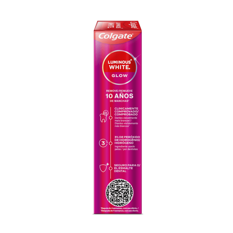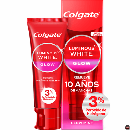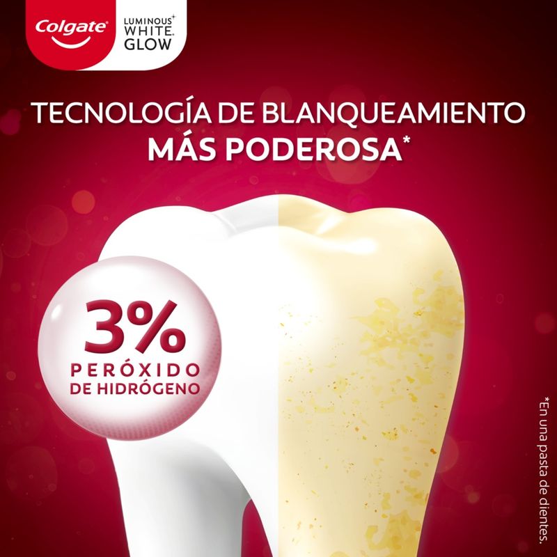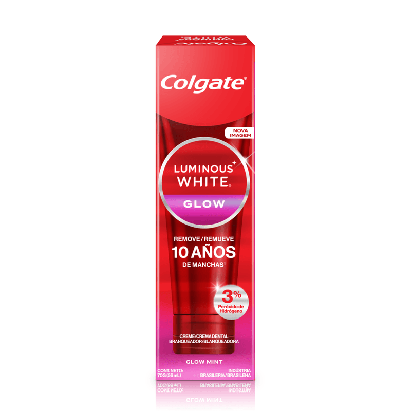 La pasta de dientes Colgate Luminous White Glow es ideal para blanquear los dientes en casa, removiendo 10 años de manchas*. Su fórmula contiene peróxido de hidrógeno al 3%, el mismo ingrediente que utilizan los dentistas para blanquear los dientes. La fórmula de esta crema dental blanqueadora no daña el esmalte dental y deja los dientes visiblemente más blancos*. La pasta de dientes Luminous White Glow contiene flúor que ayuda a proteger contra las caries y tiene un refrescante sabor a menta. Para una buena higiene bucal, cepíllese los dientes dos veces al día durante dos minutos. *Después de 4 semanas, con el uso diario. -Remueve manchas profundas -Dientes blancos -Seguro con el esmalte -Anticaries Cepillarse los dientes correctamente después de cada comida, al menos dos veces al día durante un minuto. Enjuague bien después del cepillado. Se recomienda utilizar un cepillo de dientes con cerdas suaves. No usar en menores de 18 años. Siga las recomendaciones de su dentista. Mantener fuera del alcance de los niños. No ingerir. Suspenda su uso si se observan efectos indeseables. Este producto sólo blanquea los dientes naturales. El producto no blanquea coronas, carillas, empastes o dentaduras postizas. Si necesita o ya tiene un tratamiento dental, o tiene manchas de medicamentos como la tetraciclina, consulte a su dentista para determinar si el blanqueamiento es adecuado. Algunas personas pueden experimentar sensibilidad dental y molestias en las encías cuando usan productos blanqueadores. Esta incomodidad es temporal y no dañina. En caso de sensibilidad excesiva, suspenda el uso y consulte a un dentista. Uso contraindicado para pacientes con enfermedad periodontal moderada a avanzada o personas alérgicas a cualquiera de los componentes de la fórmula. No se recomienda su uso en mujeres embarazadas o lactantes. Conservar el producto a una temperatura inferior a 30°C. Visite a su dentista regularmente.