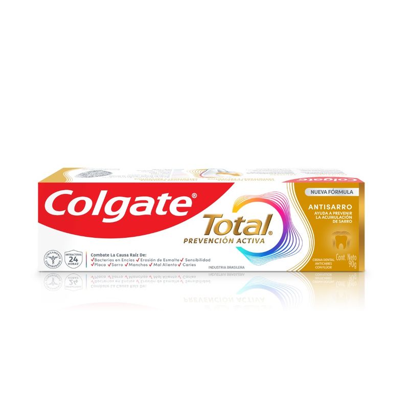 La pasta Colgate Total Antisarro es ideal en el uso diario, está clínicamente comprobada, te brinda 24 horas* de protección antibacterial y combate la causa raíz de las bacterias en las encías, erosión de esmalte, sensibilidad en los dientes, placa bacteriana, sarro dental, manchas en los dientes, mal aliento y caries dental.